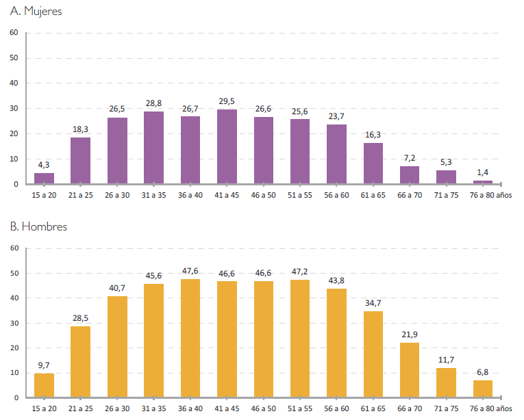 (i) En primer lugar, las personas suelen mostrar permanentes entradas y salidas del mercado laboral formal. En el caso de las mujeres, estas entradas y salidas suelen estar explicadas por los ciclos de cuidados a lo largo de la vida.
