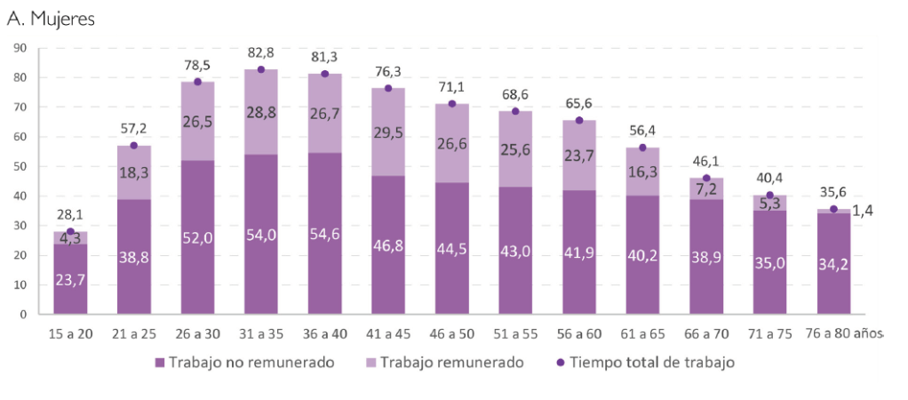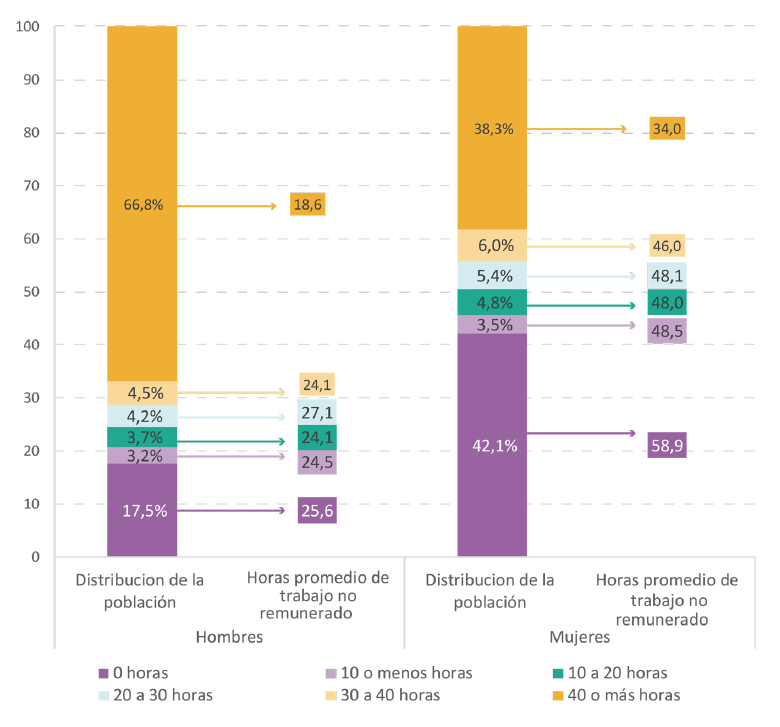 Nota: (1) Para la contabilización del trabajo no remunerado se considera el tiempo para autoconsumo de bienes, labores domésticas y de cuidados no remunerados para el propio hogar o para apoyo a otros hogares, según la Clasificación de Actividades de Uso del Tiempo para América Latina y el Caribe (CAUTAL) (CEPAL, 2016). (2) Se calculan horas para una semana completa.