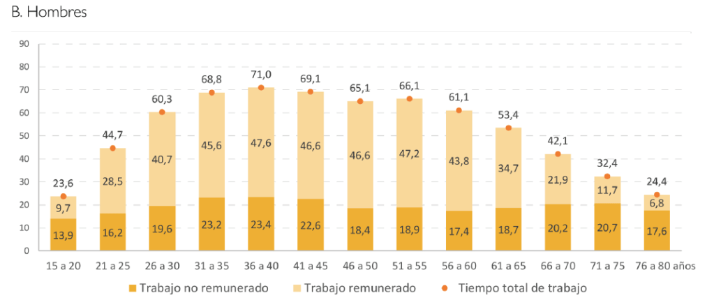 Nota: (1) Para la contabilización del trabajo remunerado se considera el tiempo de trabajo en la ocupación y actividades relacionadas y para la contabilización del trabajo no remunerado se considera el tiempo para autoconsumo de bienes, labores domésticas y de cuidados no remunerados para el propio hogar o para apoyo a otros hogares, según la Clasificación de Actividades de Uso del Tiempo para América Latina y el Caribe (CAUTAL) (CEPAL, 2016). (2) Se calculan horas para una semana completa.