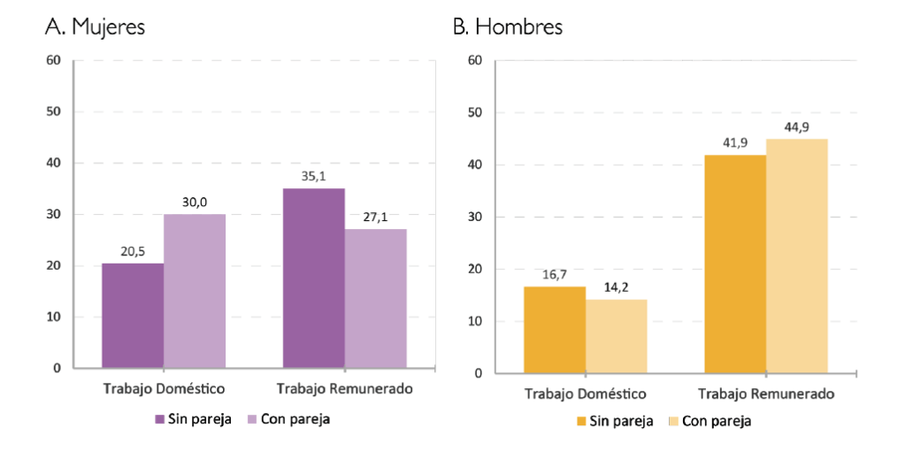 Una forma de ver esta interdependencia es analizando particularmente el trabajo doméstico que realizan tanto hombres como mujeres según su estado civil. En la Figura 6 se observa que existe una distribución de los trabajos que realizan los individuos de acuerdo a su género. Las mujeres dedican en promedio una proporción mayor de tiempo al trabajo no remunerado mientras que los hombres lo dedican al trabajo remunerado, lo que se explica comúnmente por la división sexual del trabajo. Esta figura además permite observar cómo mujeres que se encuentran en una relación heterosexual y en pareja tienen en promedio mayor carga de trabajo doméstico que aquellas que no lo están.